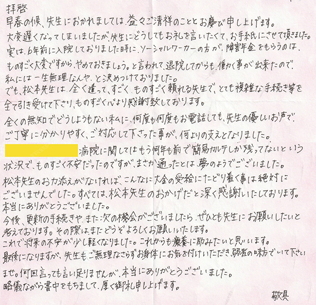 私どものサポートにより障害年金を受給できたご相談者様から、感謝のお手紙を頂きました。